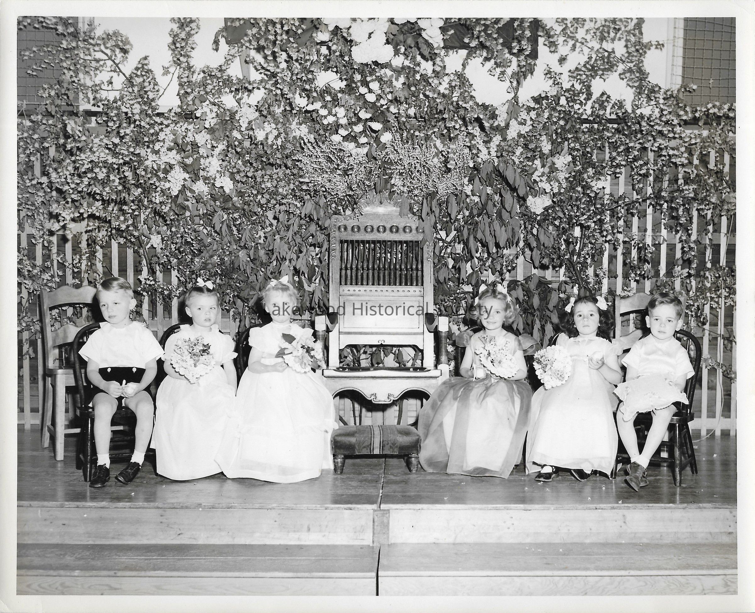 Black and white photograph of six children sitting in little chairs on either side of a throne. They are dressed up and the girls are holding little bouquets. Behind the throne is a wall of crawling vines and flowers.