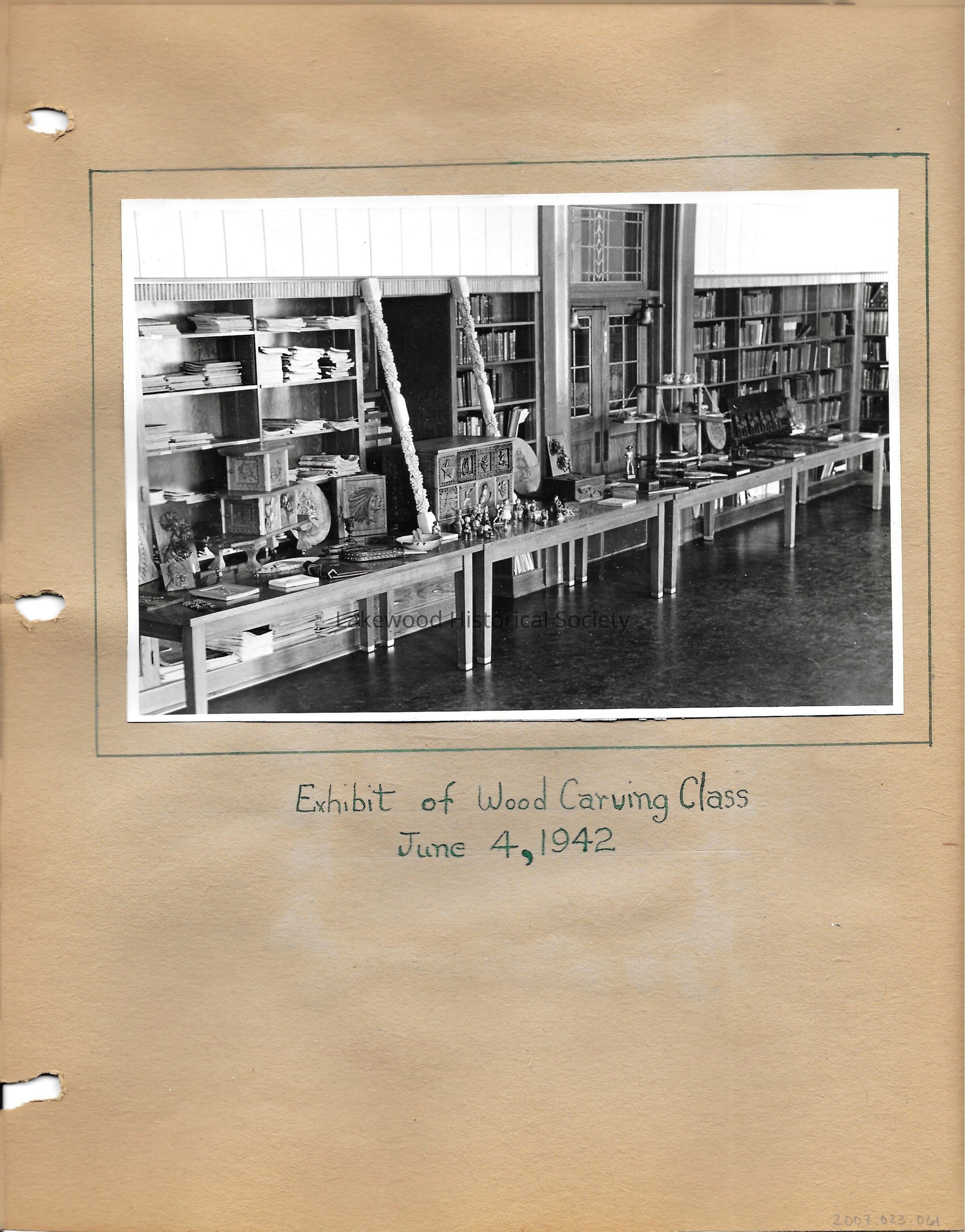 Black and white photograph captioned "Exhibit of Wood Carving Class / June 4, 1942." No additional information on where this took place. The picture shows a room with inset bookcases, filled with books. There is a door in between them. There are four tables laid out directly in front of book cases and door. Each one is packed full of wood carved arts.