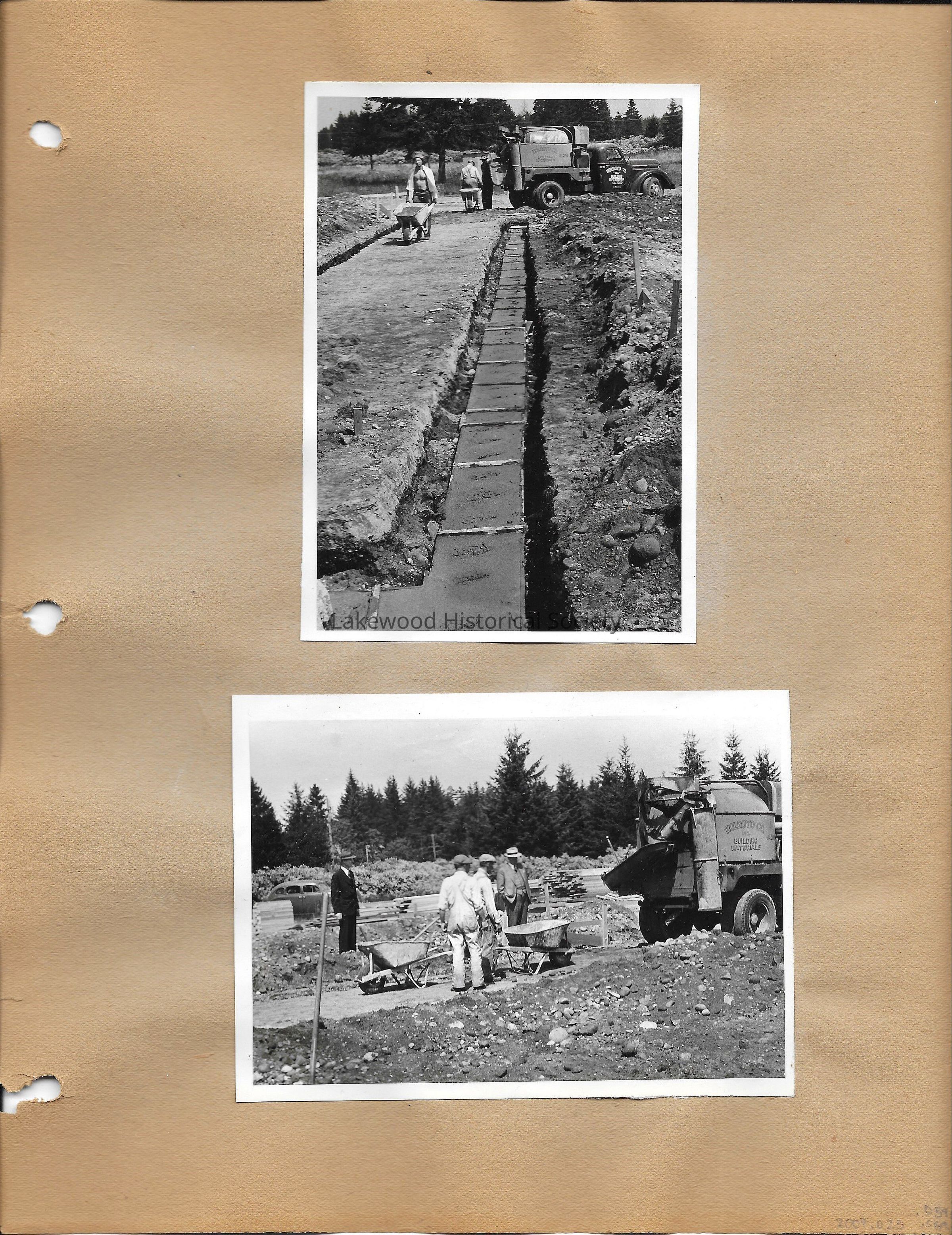 Two black and white photographs of construction on Lake City School, May 21, 1942. Two close-up shots of construction workers laying cement and pushing wheelbarrows.Photograph Details