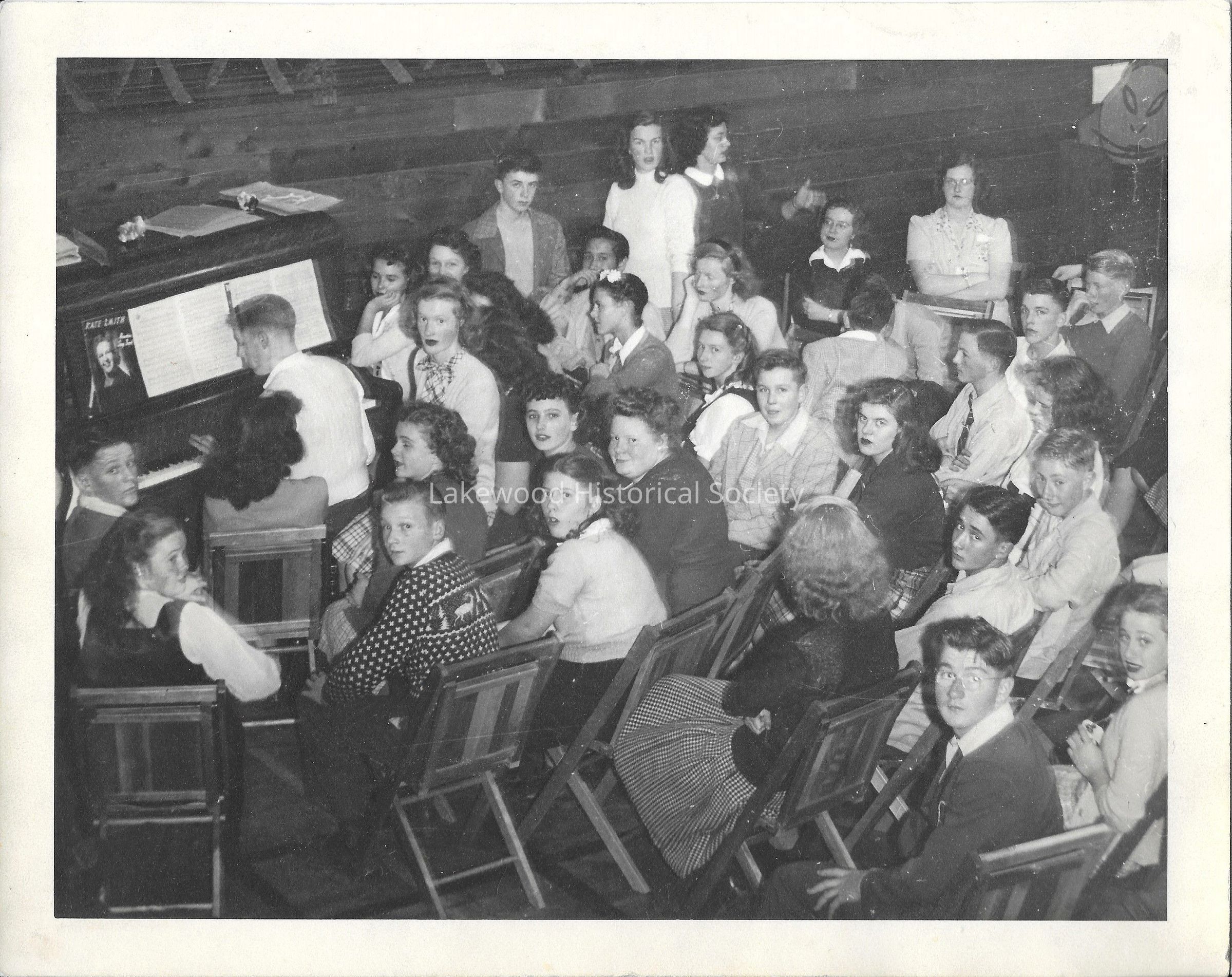 Black and white photograph of a large group of teenagers gathered around a piano. A young man is playing. Most of the others are looking at the camera.