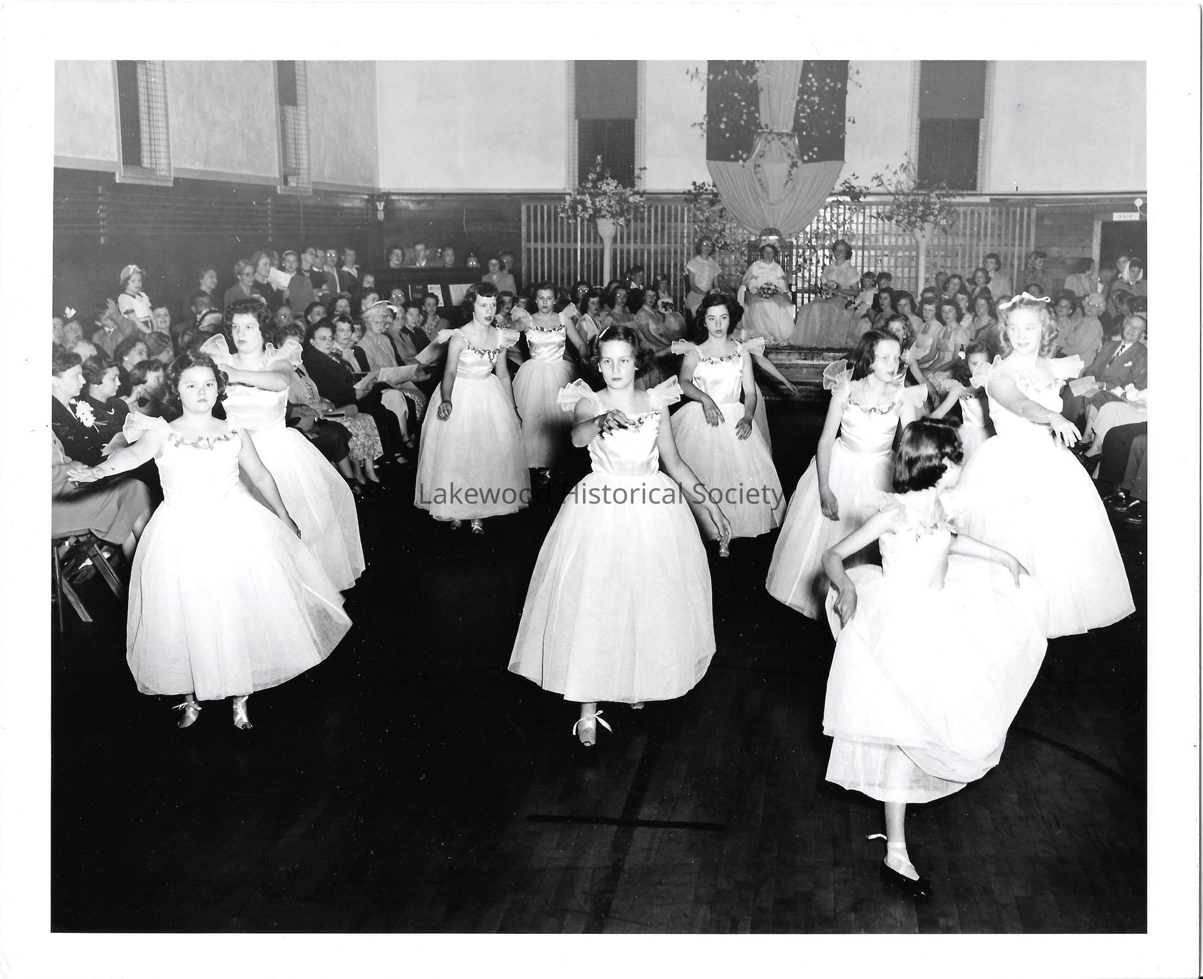 Black and white photograph of girls in white dresses appearing to do a ballet performance in front of a small crowd. The crowd is seated, some looking at programs. The room they are in has a dark bottom half and tall bright walls that expand up beyond the photo. At the back of the room are three young women sitting, on in the middle in a chair or throne.Photograph Details
