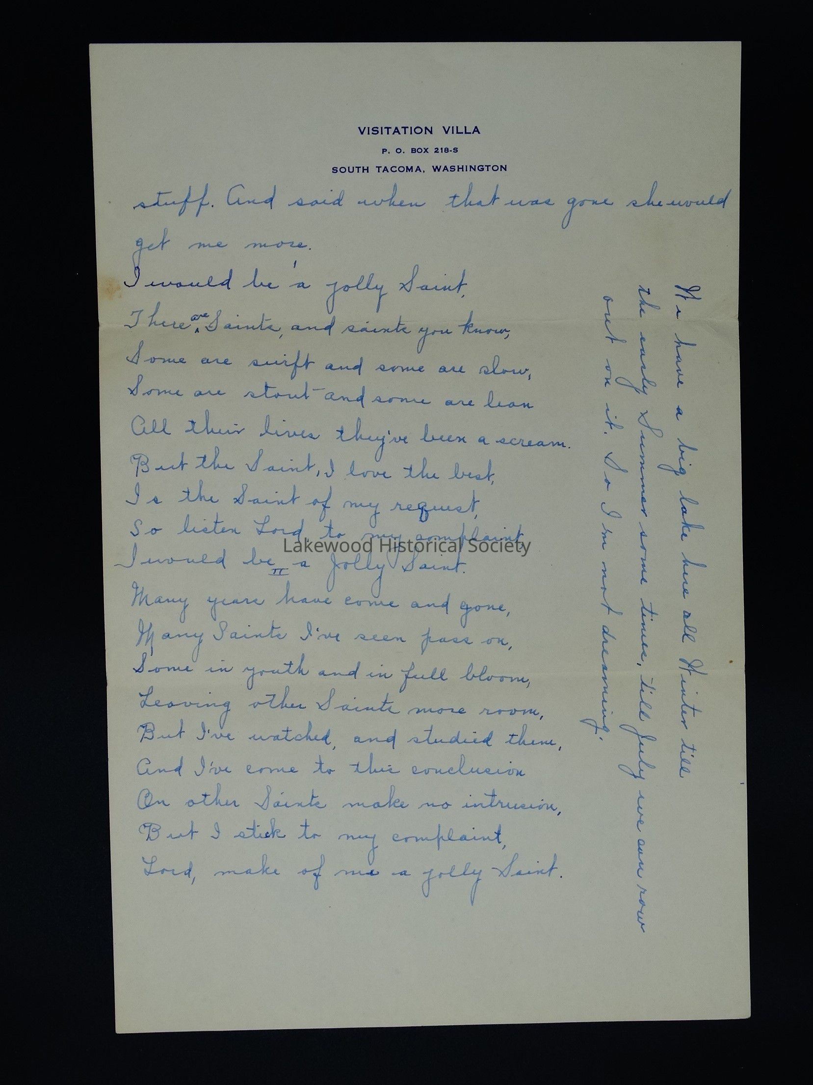 Subject: Visitation Villa, Sister Mary Anna (ne: Alice G. Goodwin) c. 1938-1940 Letter (partial) written by Sister Mary Anna while serving at Visitation Villa, containing some notes and poetic verses. Written on Visitation Villa letterhead.Creator