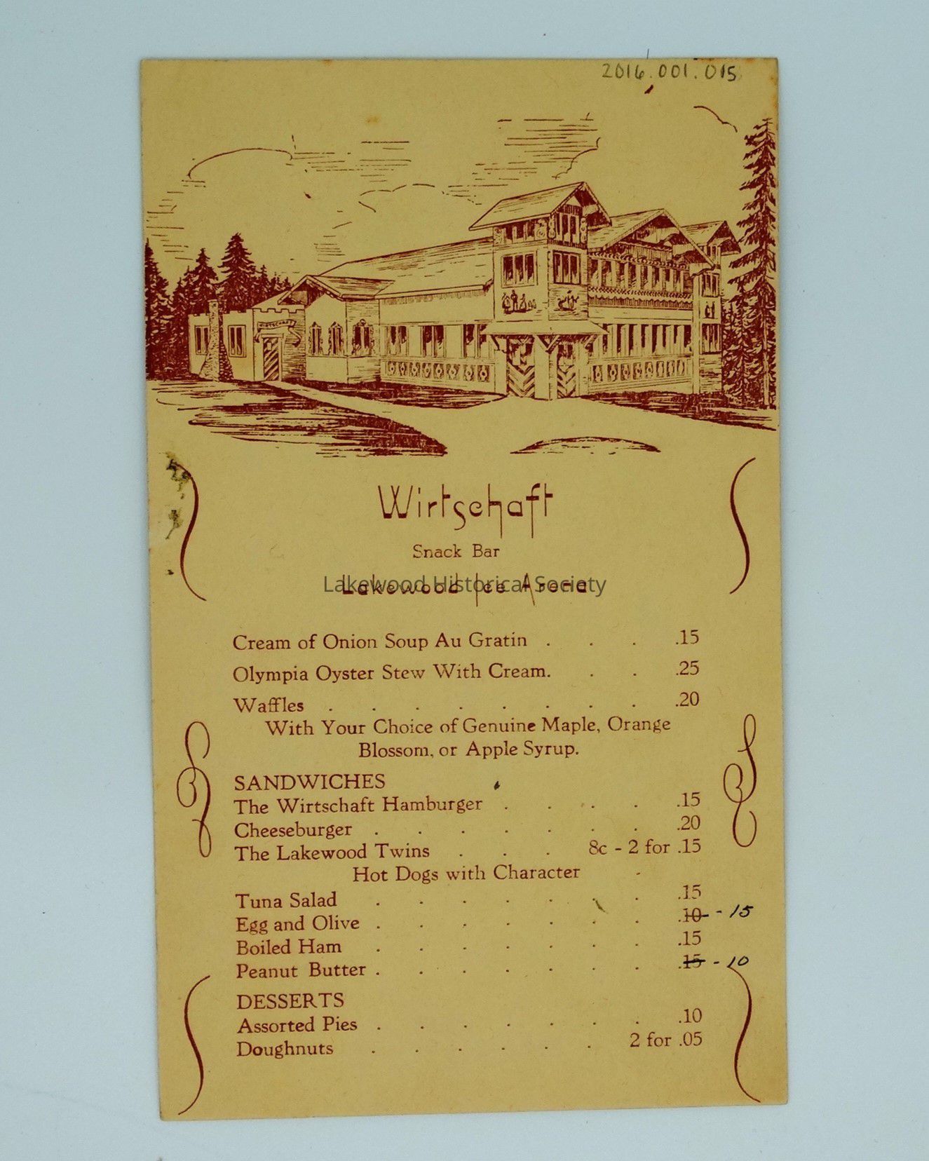 Wirtschaft Snack Bar menu from Lakewood Ice Arena. Includes soups, waffles, sanwiches, hot dogs, desserts, sundaes, sodas, ice cream, milk drinks, hot drinks, and soft drinks. *has edits written in black inkCreator