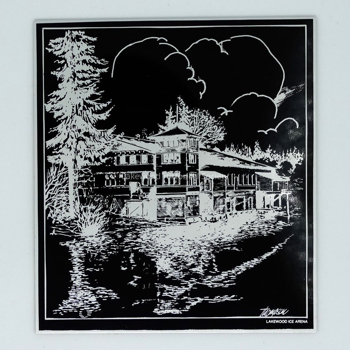 Glass plate with Lakewood Ice Arena printed on front, black/silver.Inscription/Signature/Marks
