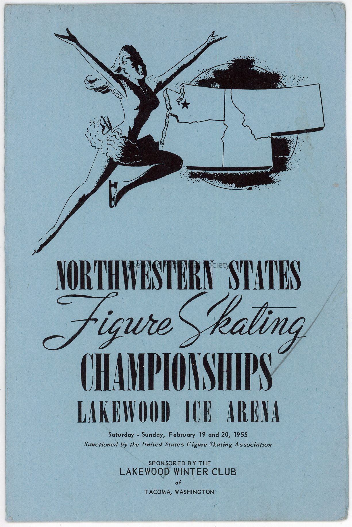 1955 program from Northwestern States Figure Skating Championships, held at the Lakewood Ice Arena, sponsored by the Lakewood Winter Club