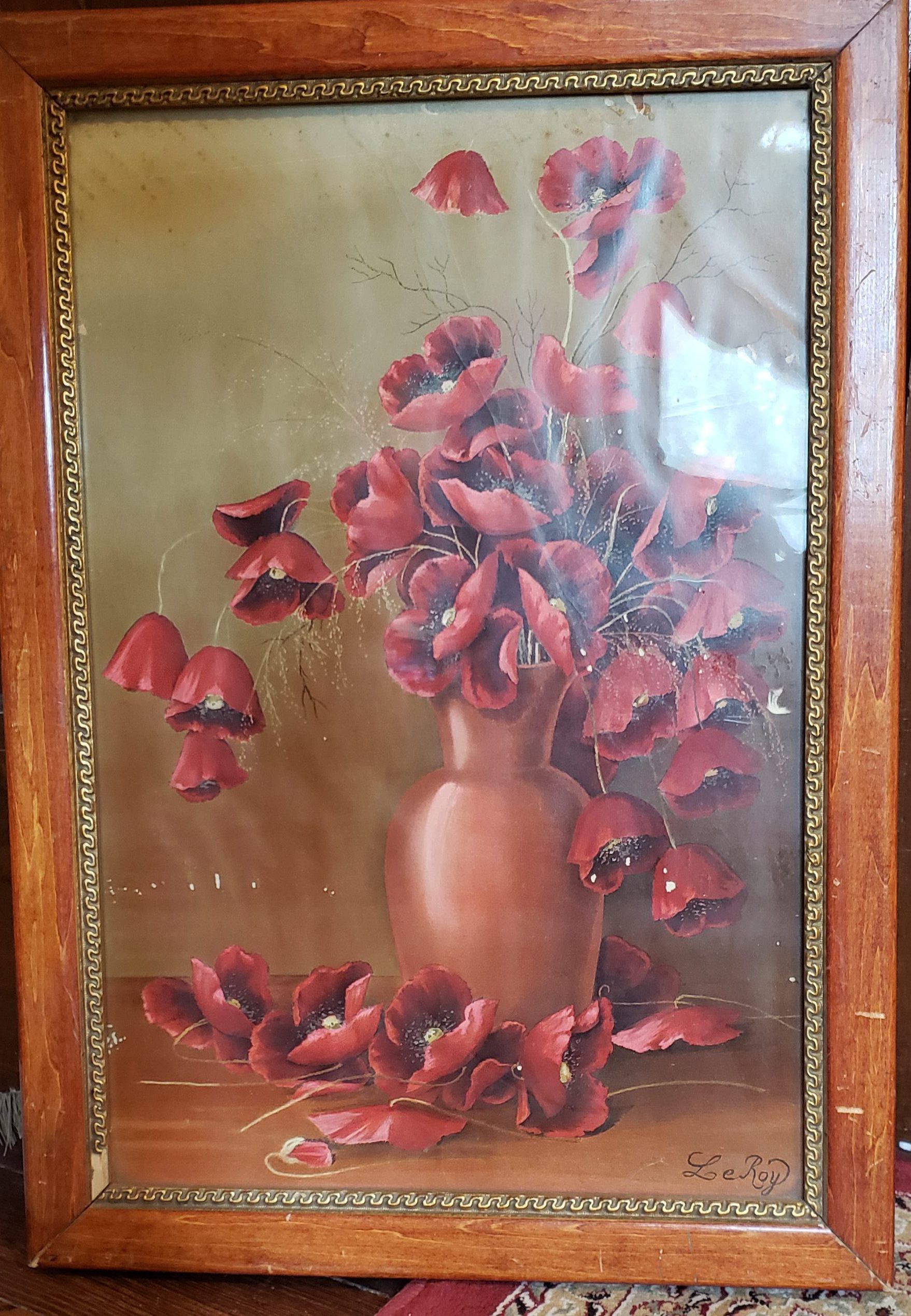 framed picture; vase of red poppies; wood frame with gold carved insert next to picture; 15" x 21"