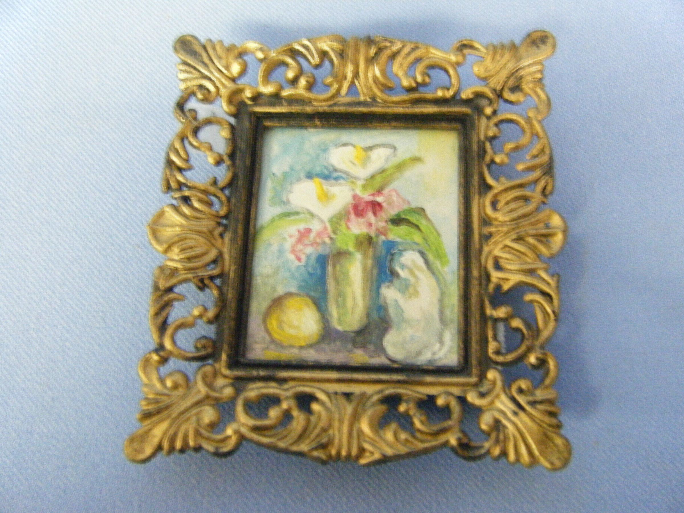 black plastic frame, painted gold on the front; painting is on cardboard; it is held in the frame by a black plastic panel; painting is of flowers in a vase sitting on a table, there is a figure praying to the right of the base of the vase