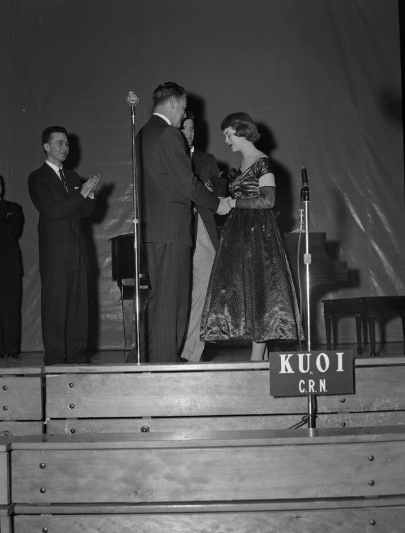 A man and a woman hold hands on stage behind microphones. A man behind them is watching them and clapping. A sign is in the front for KUOI C.R.N.