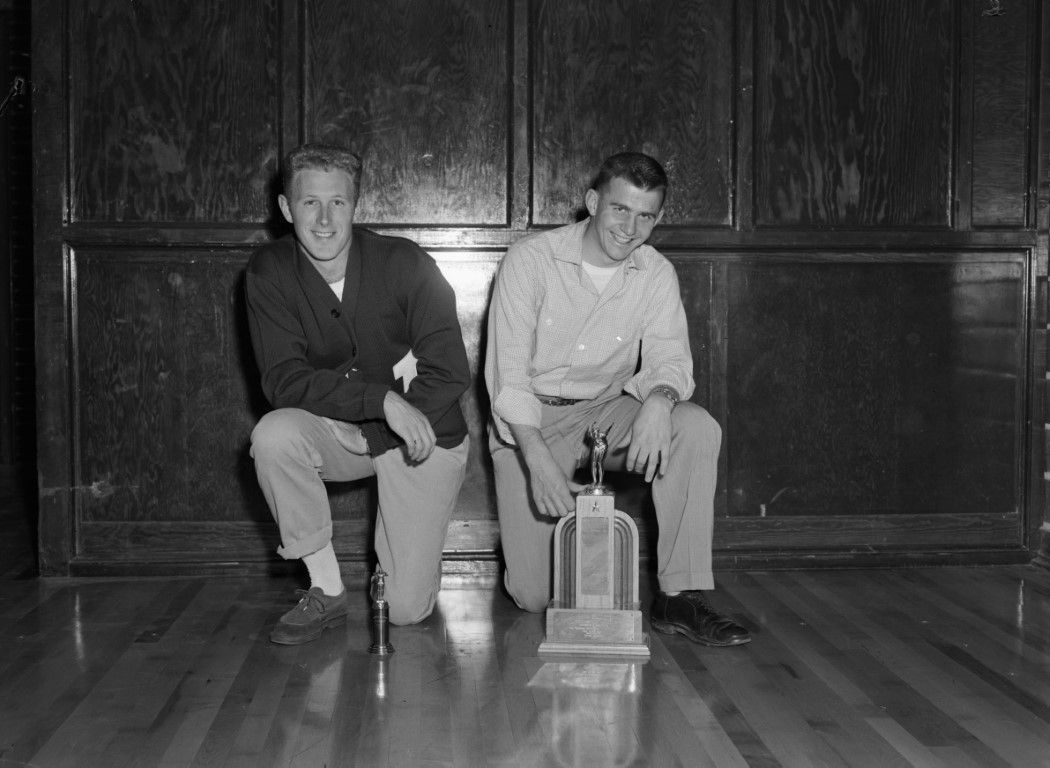 Two men posing for pictures on one knee with trophies they won for swim team.
