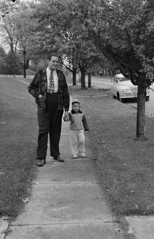 A father and his son going for a walk down the sidewalk with a car parked on the side of the street in the background.