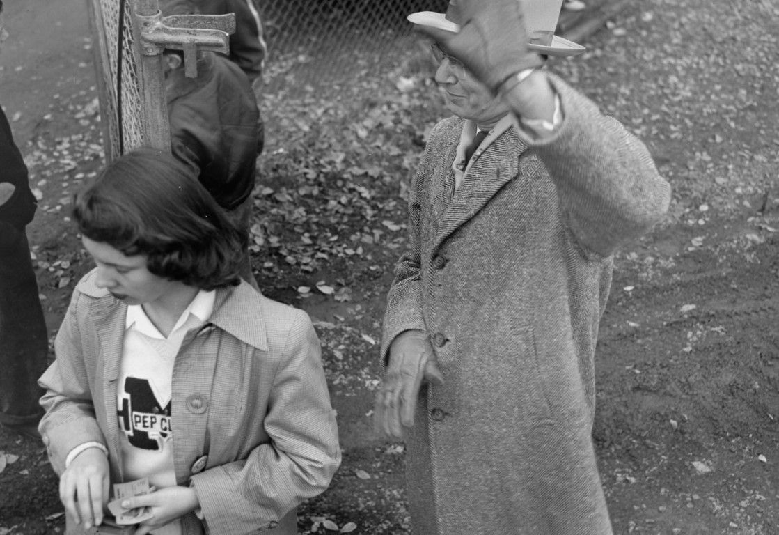 A man and woman standing in a gate opening. The woman is wearing a pep club sweater.
