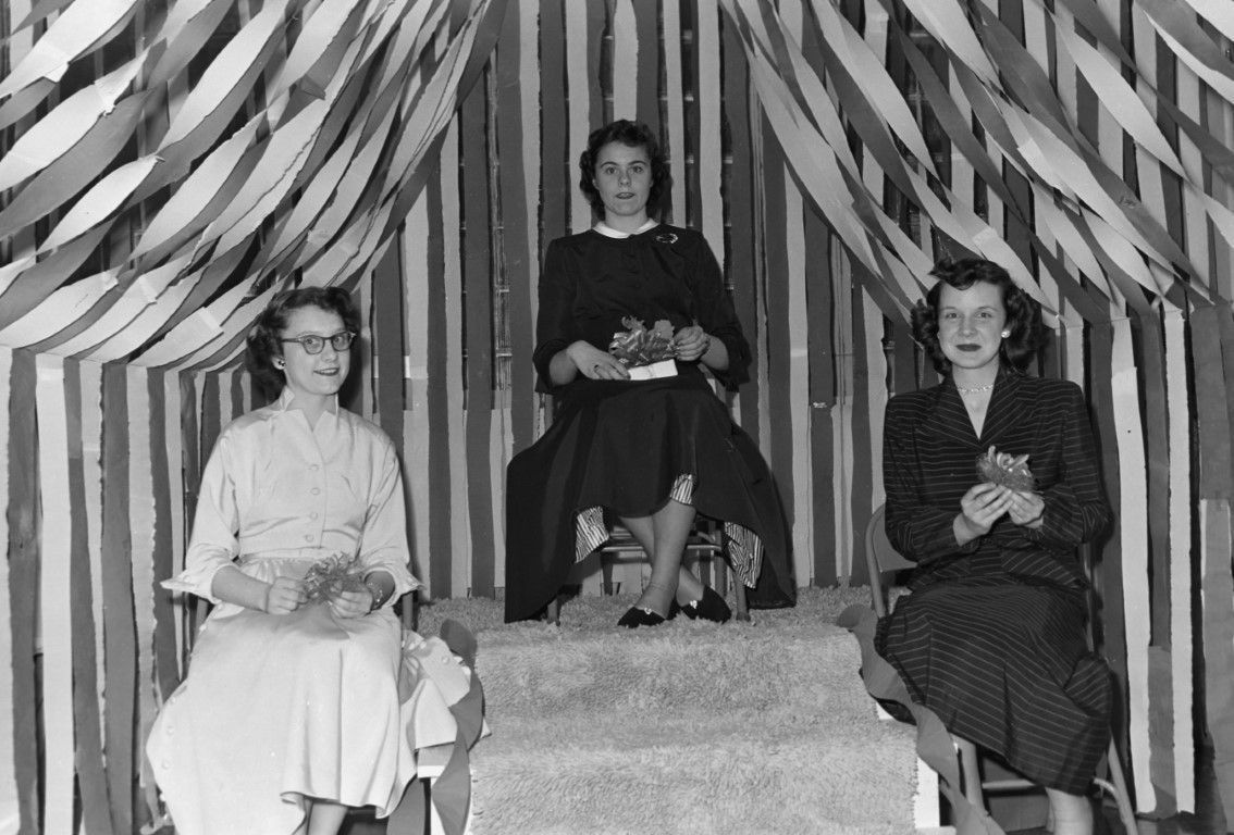 Three women in dresses sitting in chairs holding corsages on a decorated platform.