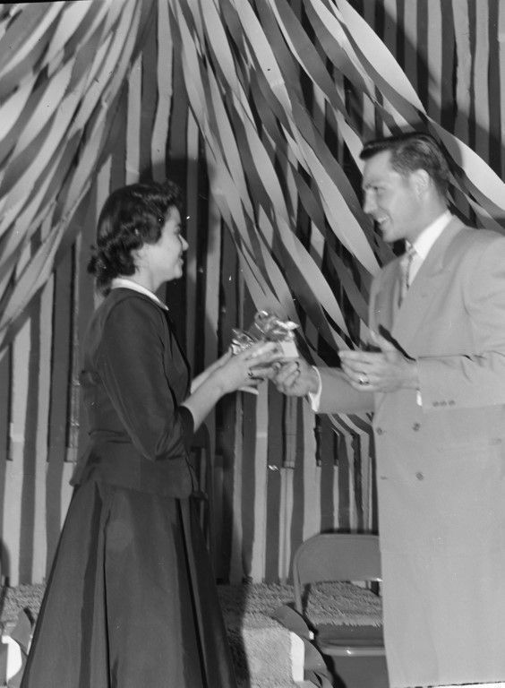 A woman is handed a gift from a man in a suit standing in front of a decorated platform.