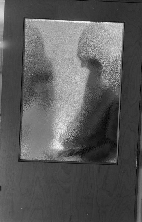 Silhouettes of two men standing in the frosted window of a door.