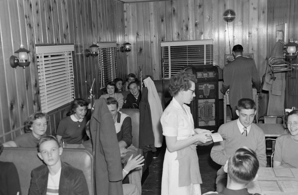 Numerous young people sitting at booths in a restaurant while a server takes orders.