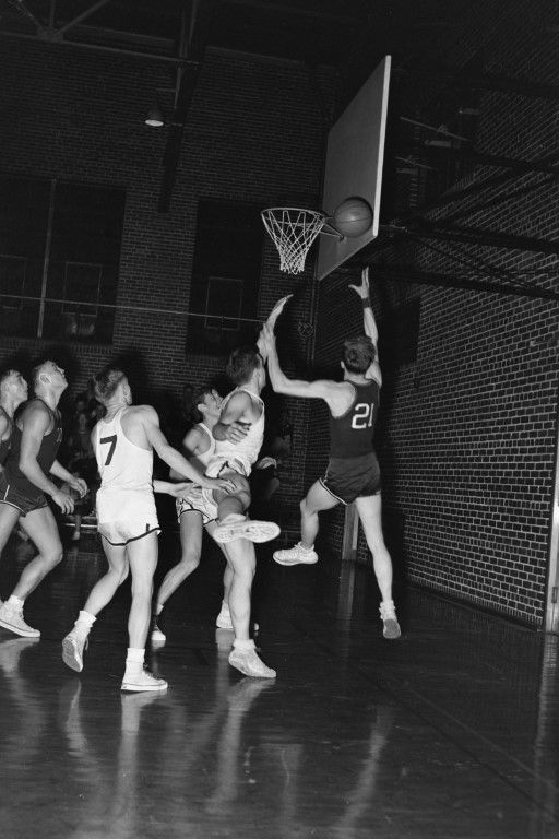 A basketball player is shooting a layup while players from both teams are converging on the basket.