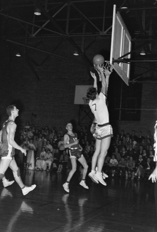 Two basketball players are going up for the rebound with others moving toward the basket.