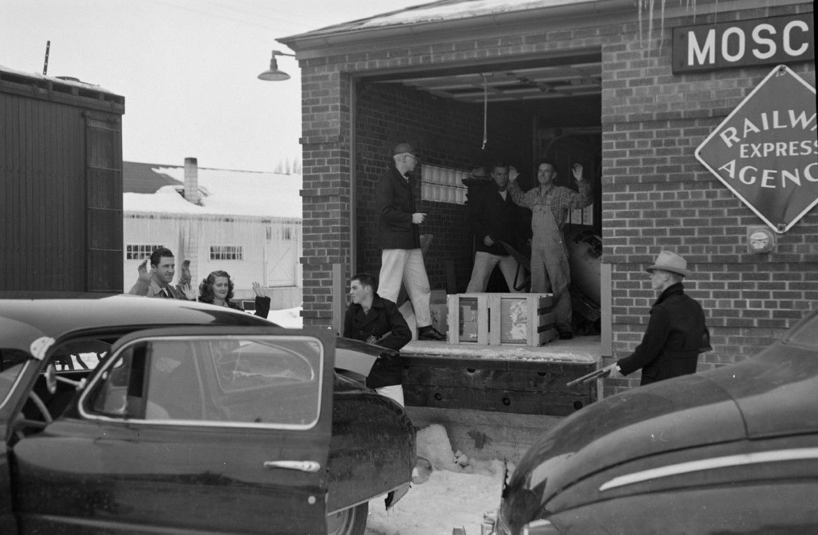 Four men with guns are staging a mock armed robbery against three victims at the Railway Express Agency loading dock.