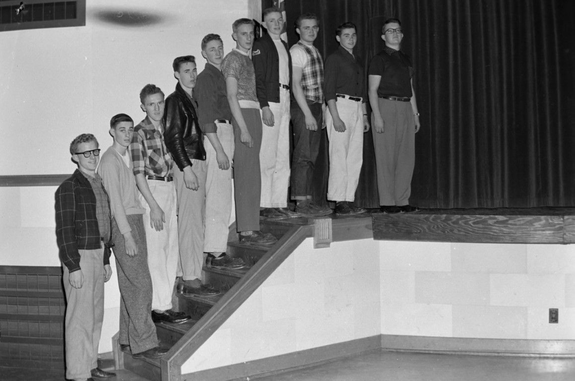Several young men are lined up on the stairs to the stage and being photographed.