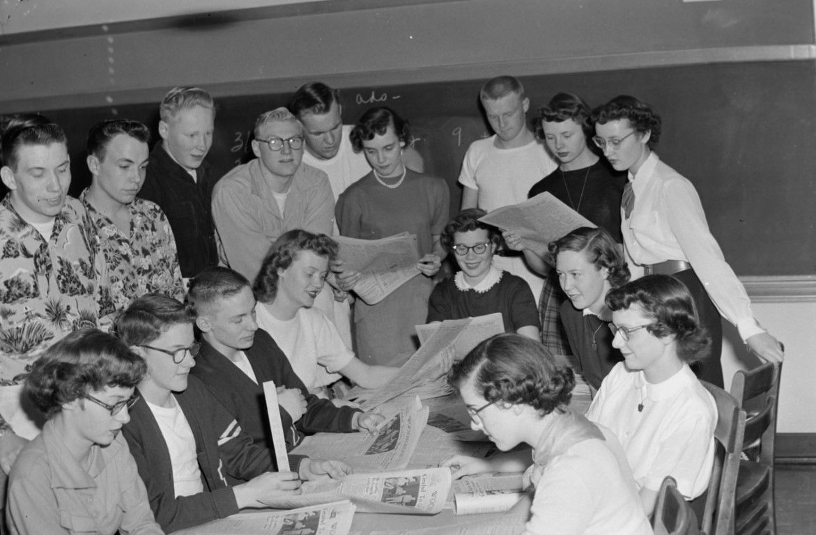 A group of people gathered around or standing near a table are reading the Wocsomonian newspaper.