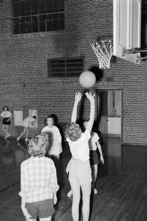 Girls in gym clothes are playing basketball. One player is shooting the ball while others are looking on or getting a drink of water from the fountain.