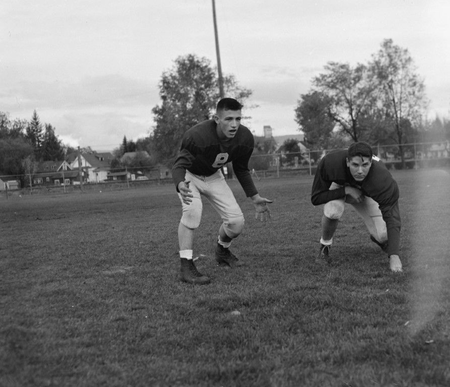 Two football players in uniform with no helmet are posing for a photo on the field. Moscow football Ghormley Park