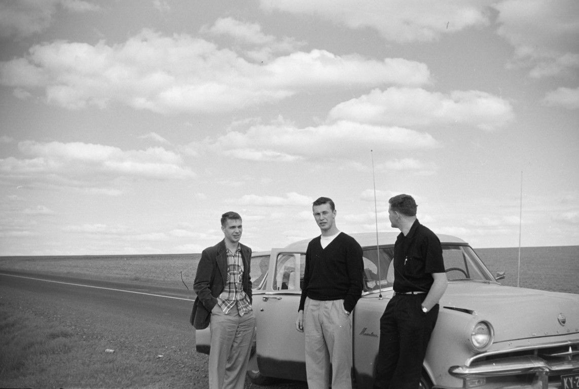 Three young men standing on the side of the road next to a car surrounded by farm fields.