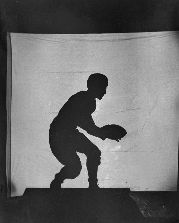 A hunched over football player in silhouette on a screen is seen holding the ball in front of him.