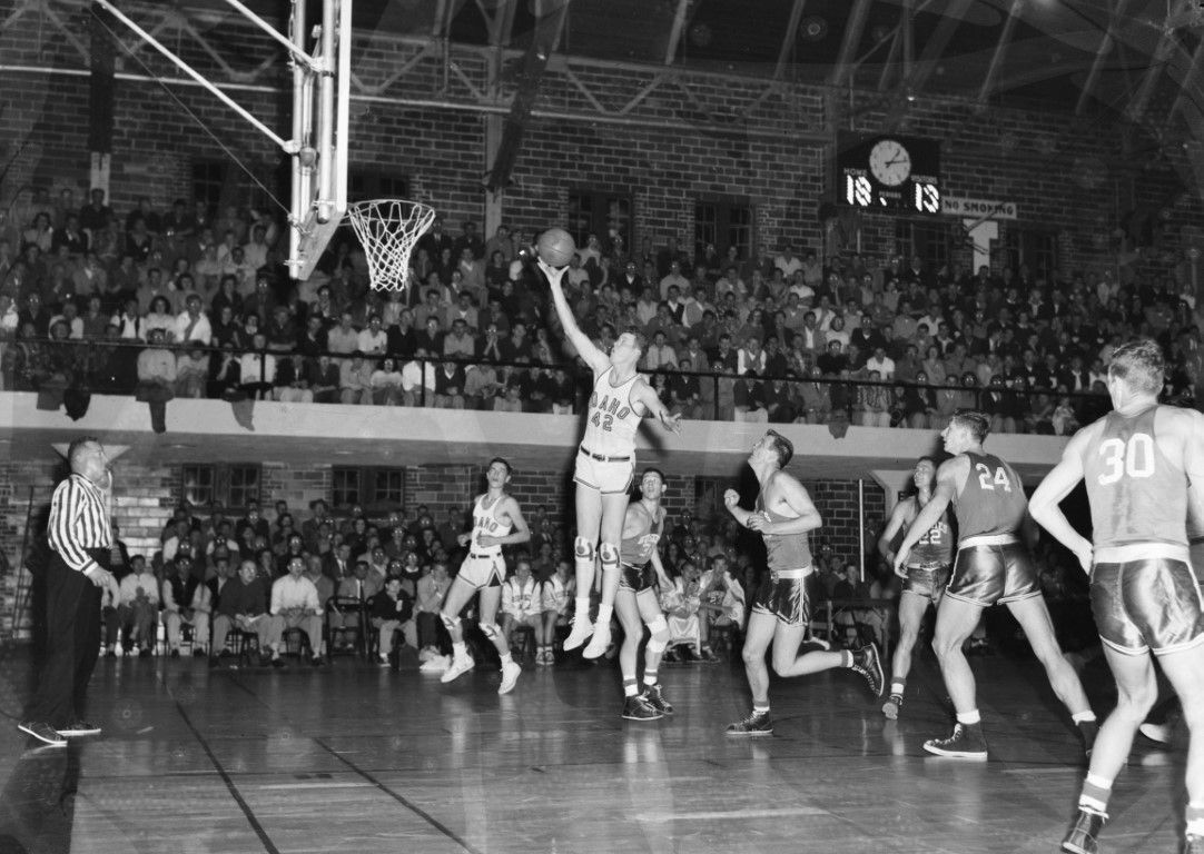 An Idaho basketball player leaps for the rebound during a game against the Washington Huskies in front of a large crowd of spectators. The Vandals are leading 18 to 13.