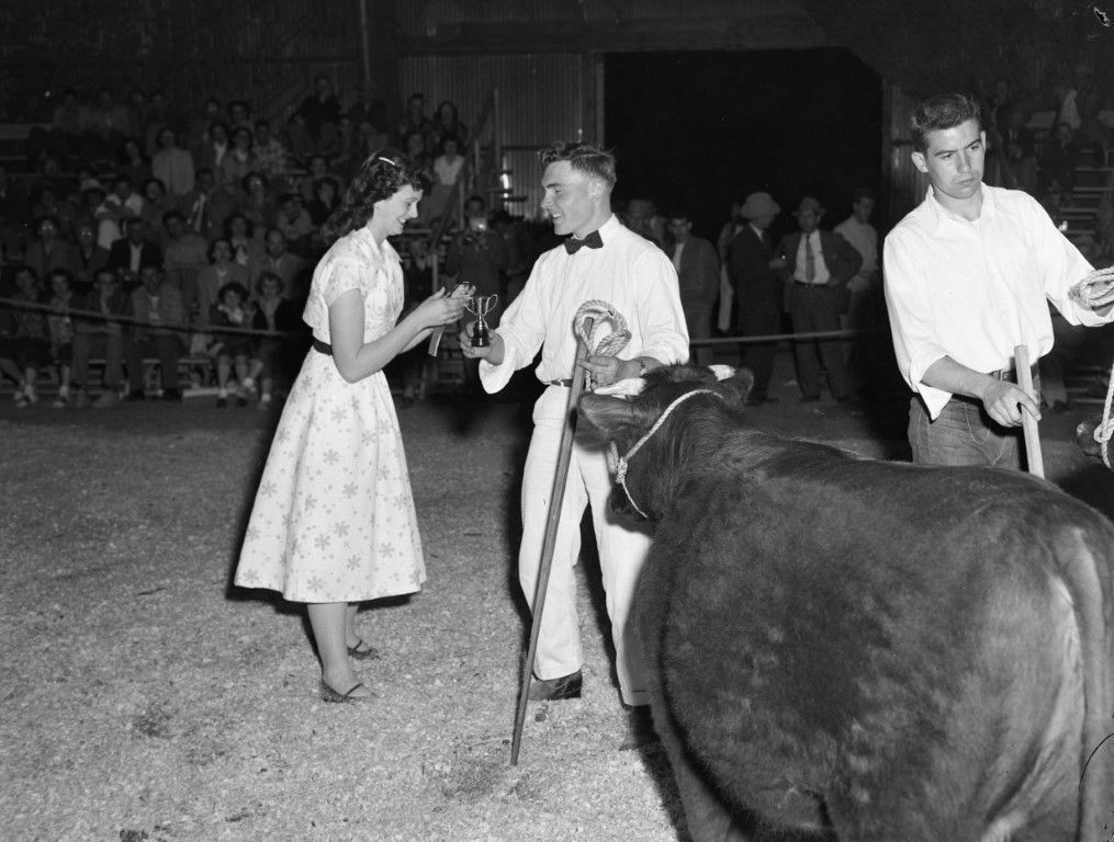 A woman is handing a young man a trophy and a ribbon in front of his prize-winning cow at an agricultural show.