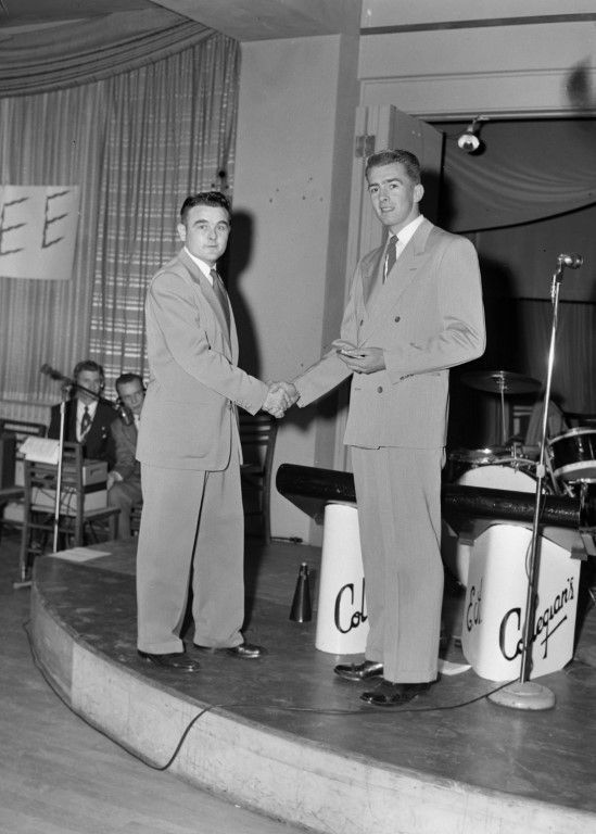 Two men in suits shaking hands on a stage in front of a drum kit and microphone.