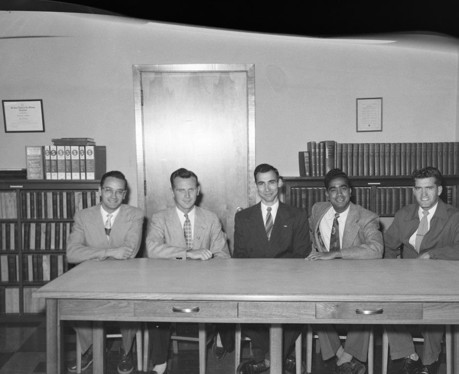 Five men in suits sitting at a table in front of bookshelves smiling and being photographed.