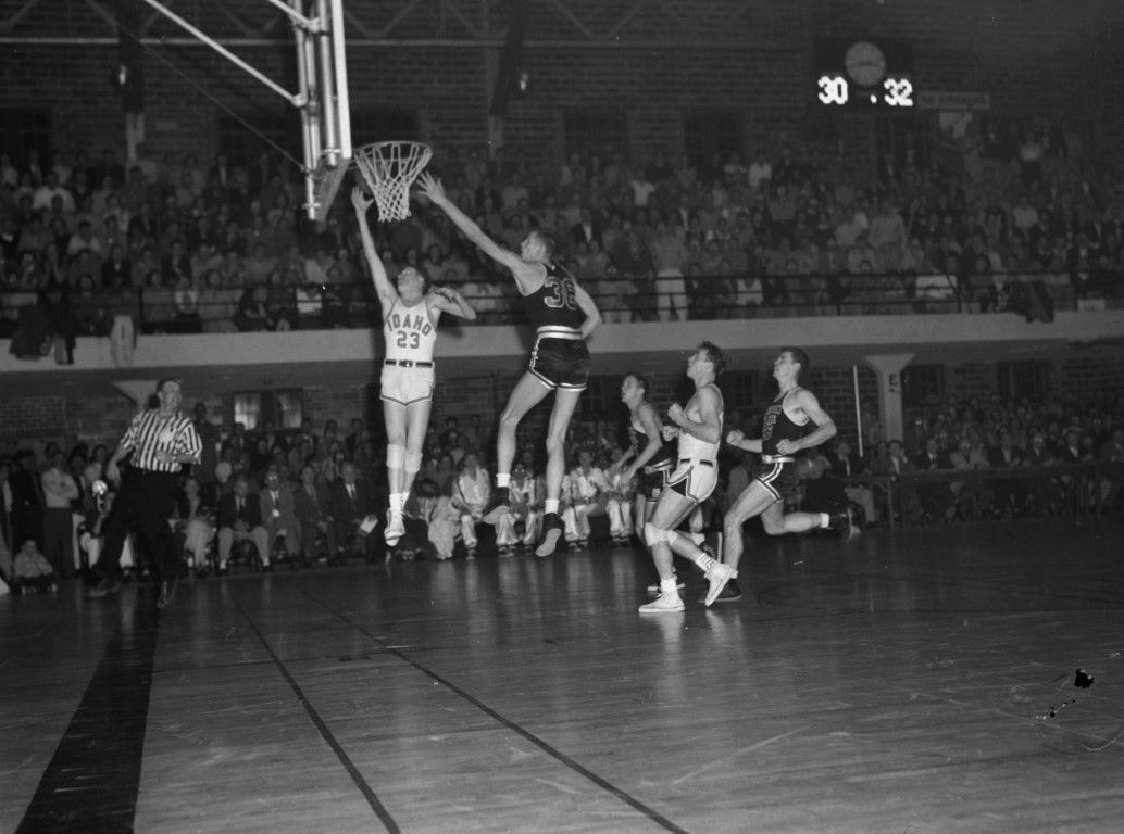 A University of Idaho basketball player attempts a layup while the Oregon State defender tries to block the shot with the score showing 30-32.