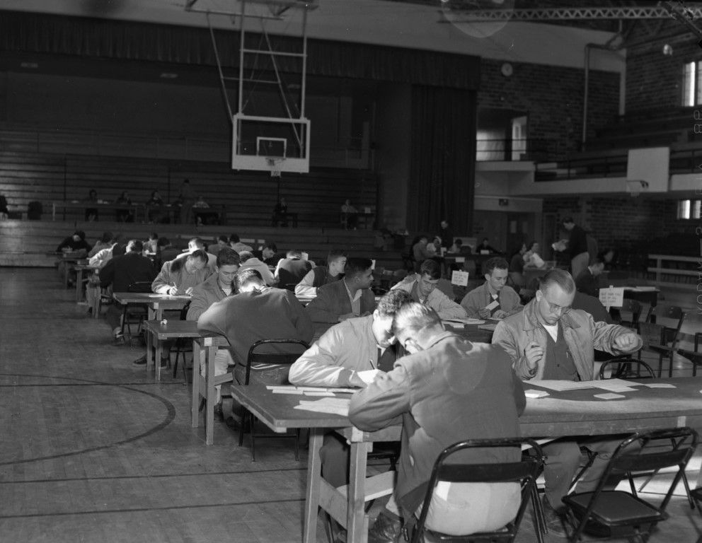 Men sitting at tables and filling out paperwork in the gymnasium.