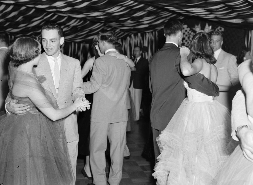 Young couples in formal attire are slow dancing in a room which has decorated ceiling and walls. A man playing saxophone can be seen in the background.