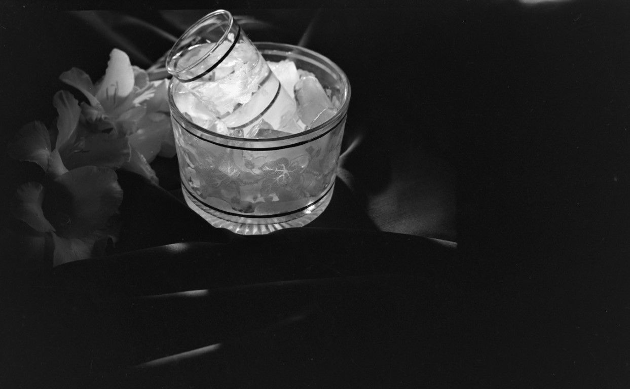 A glass full of clear liquid sits in an a glass ice bucket full of ice, both have the same etched leaf design and bands around top and bottom. They sit on a draped cloth with flowers arranged beside them. Similar to 1138.