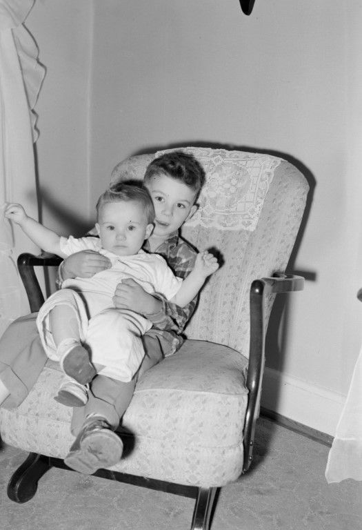 A little boy sitting in a chair with a toddler in his lap