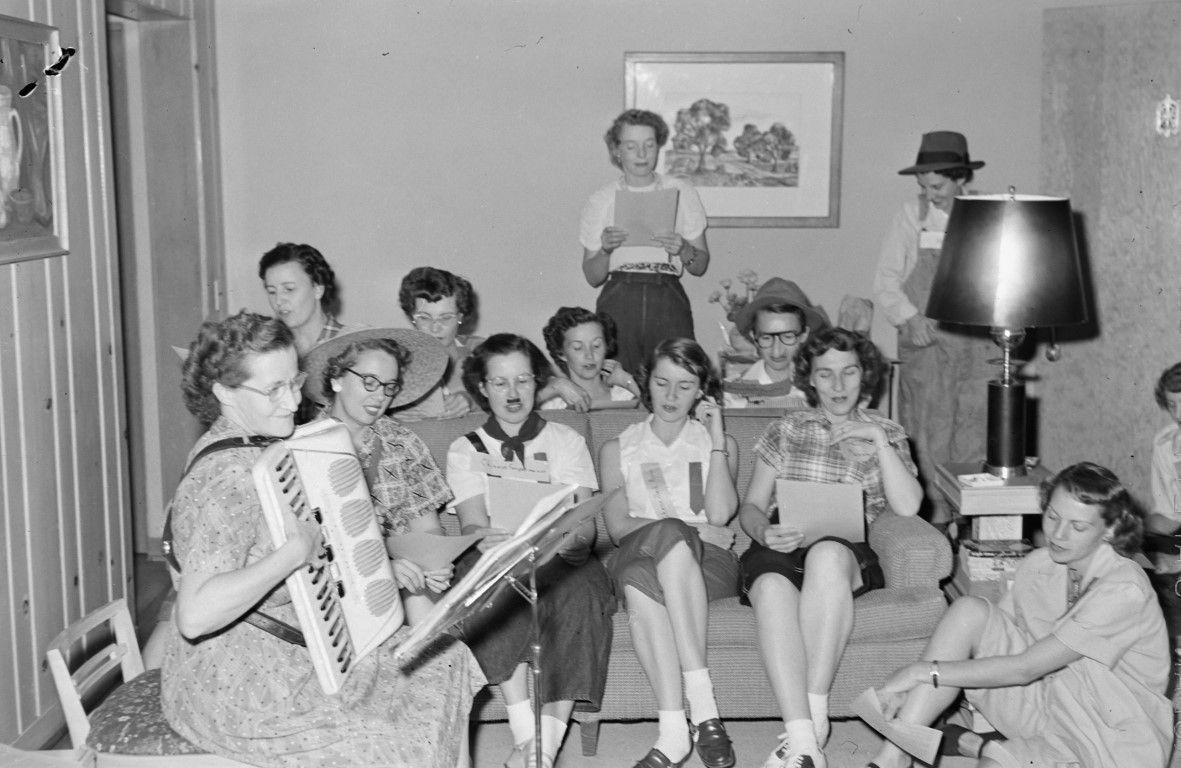 A large group of women sitting in a living room, apparently practicing a play. Some are wearing costumes. A woman plays the accordian on the left. (Group of photos: 1234, 1236, 1238, 1239, 1240, 1241)