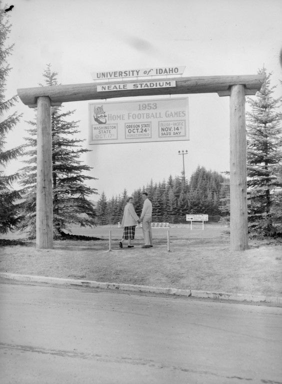 A man and a woman holding hands underneath the entrance arch to Neale Stadium at the University of Idaho. A sign on the arch says "1953 Home Football Games - Washington State Oct 17th - Oregon State Oct 24th Homecoming - College of the Pacific Nov 14th Dad's Day"