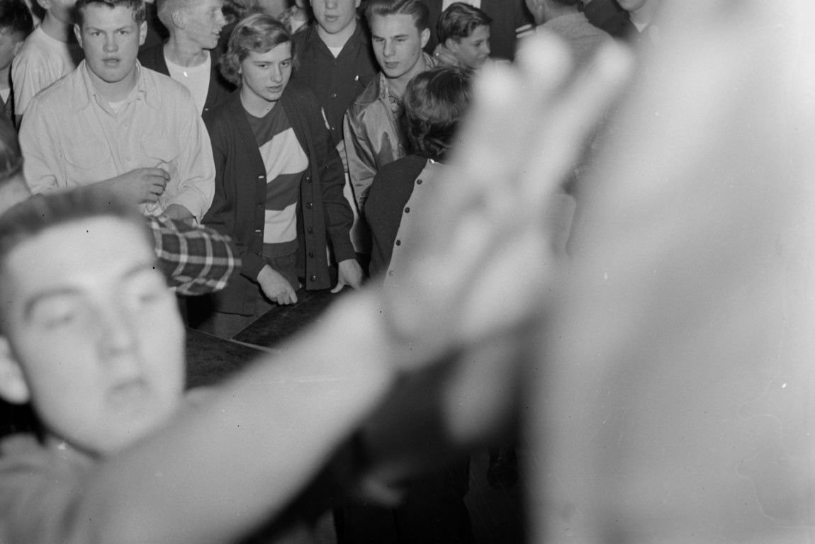 Young people closely assembled in a crowd with a man in the foreground reaching for something.
