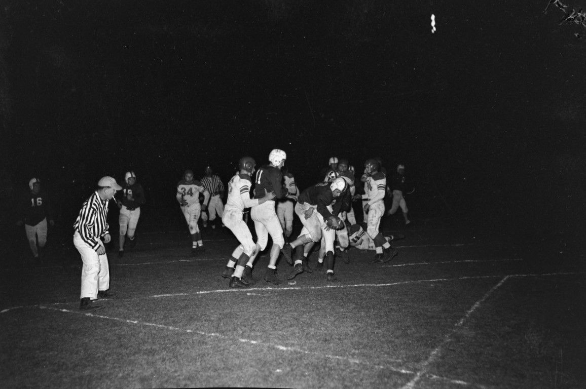 Football players and officials in action on the field.