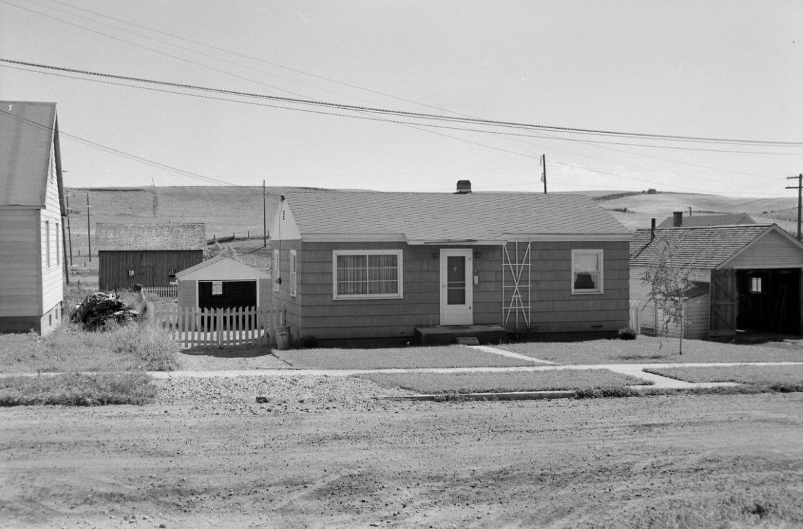 The front of the house in 1189, further away view showing neighboring structures and dirt road in front and bare hills behind.