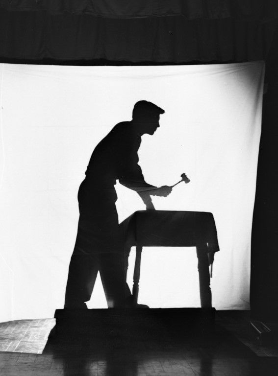 A silhouette of a man standing at a table with a raised gavel.