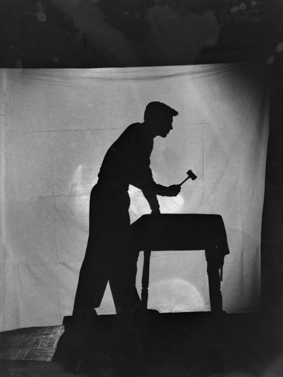 A silhouette of a man standing at a table with a raised gavel.