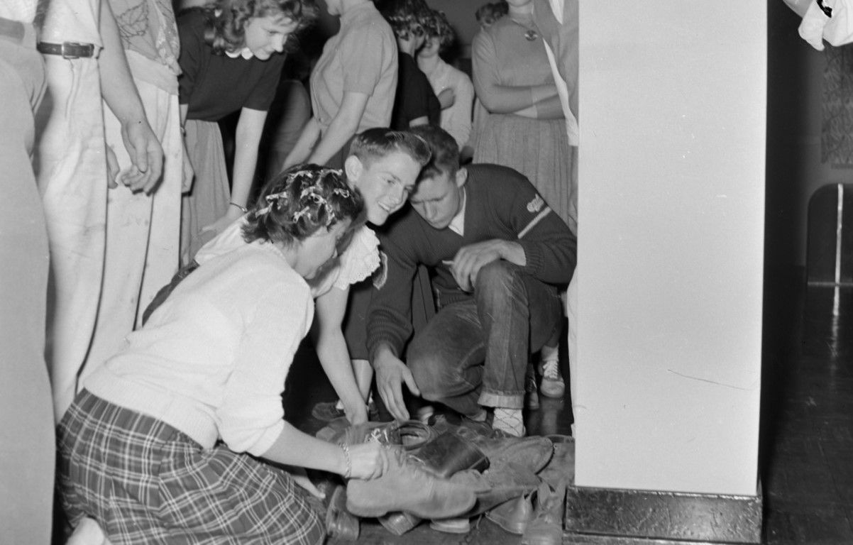 A group of young people is sorting through a pile of shoes on the floor.
