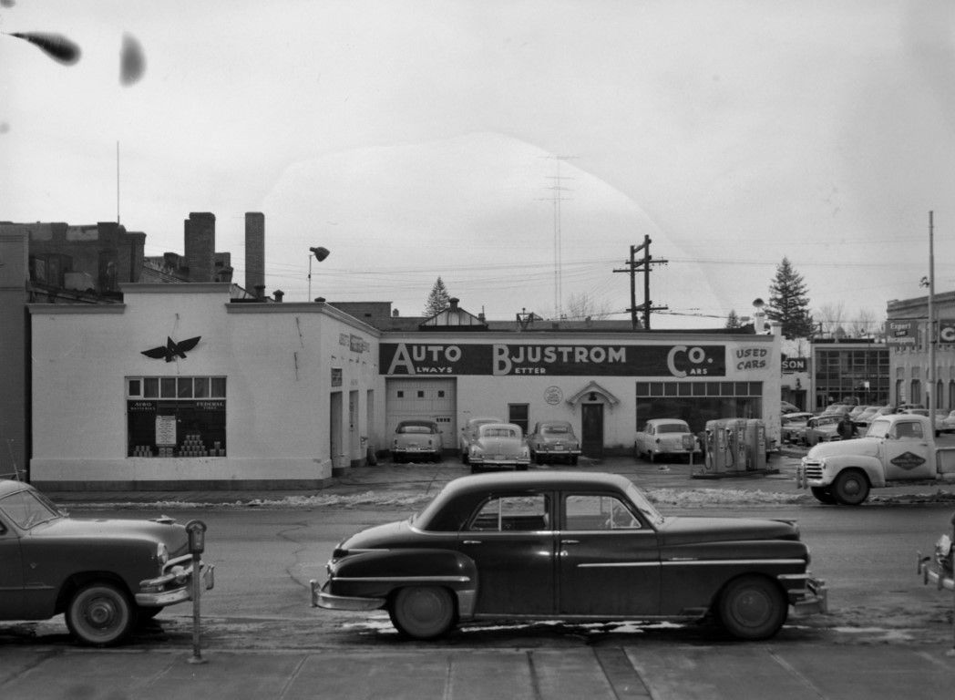 Cars parked on the street and in the lot of the Auto Bjustrom Co. (Always Better Cars) used car dealership. Gas pumps are in the lot and a "Flying A" sign is on the building. This is the SW corner of 2nd and Wasington Streets, looking West