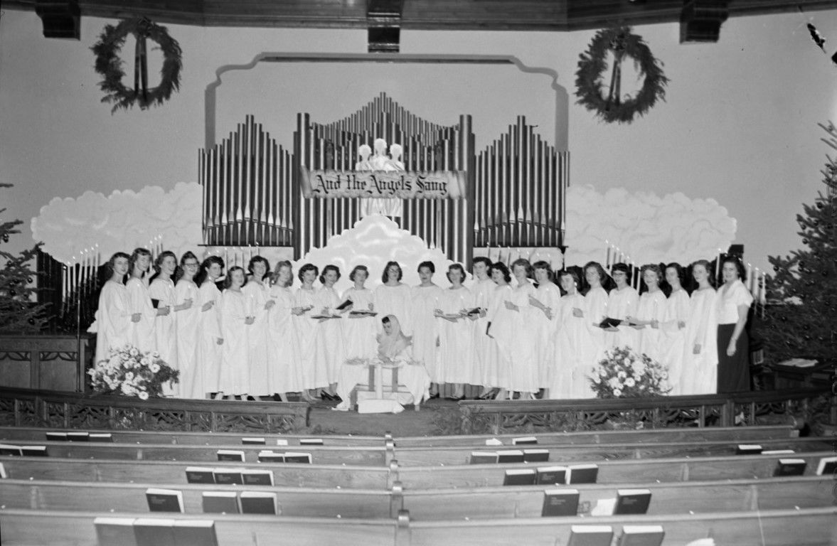 A church choir posing for a holiday performance in the pulpit.