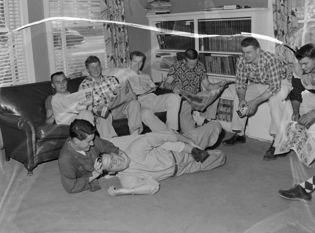 A bunch of young guys lounging, reading the newspaper, and clowning around in the living room.