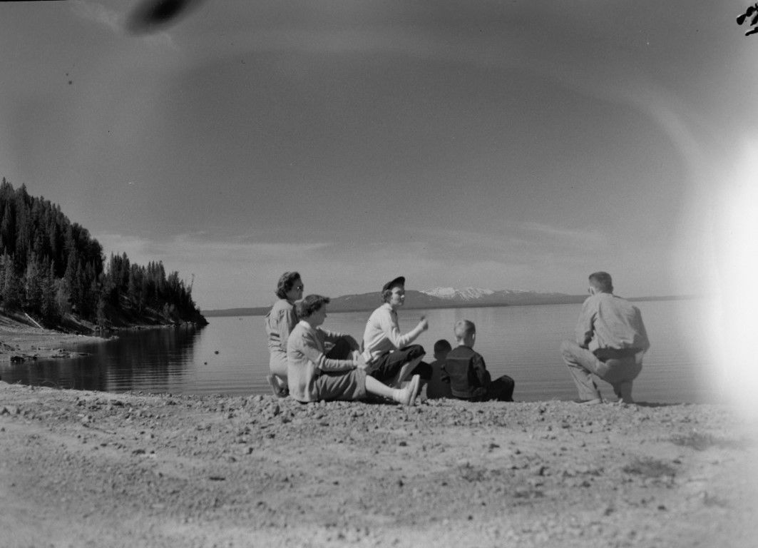 A small group of adults and children are seated on the ground at the lakeshore with a range of snow-capped mountains in the distance.