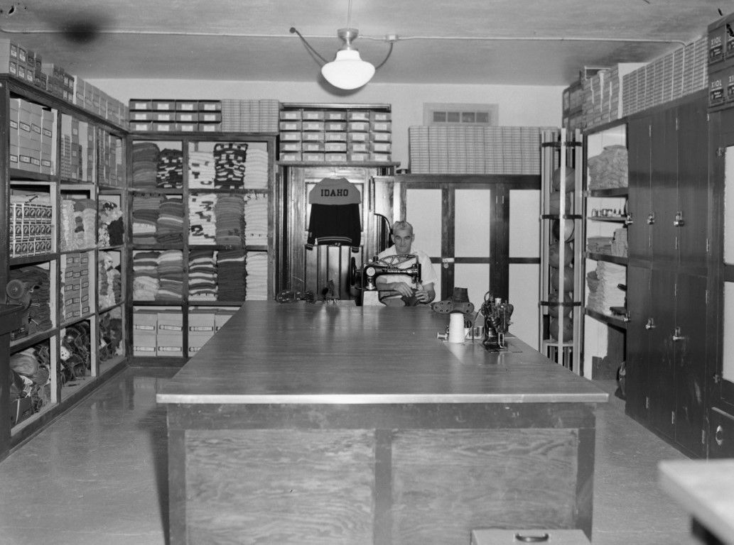 A man sitting at a sewing machine in a room filled with athletic apparel and sports equipment.